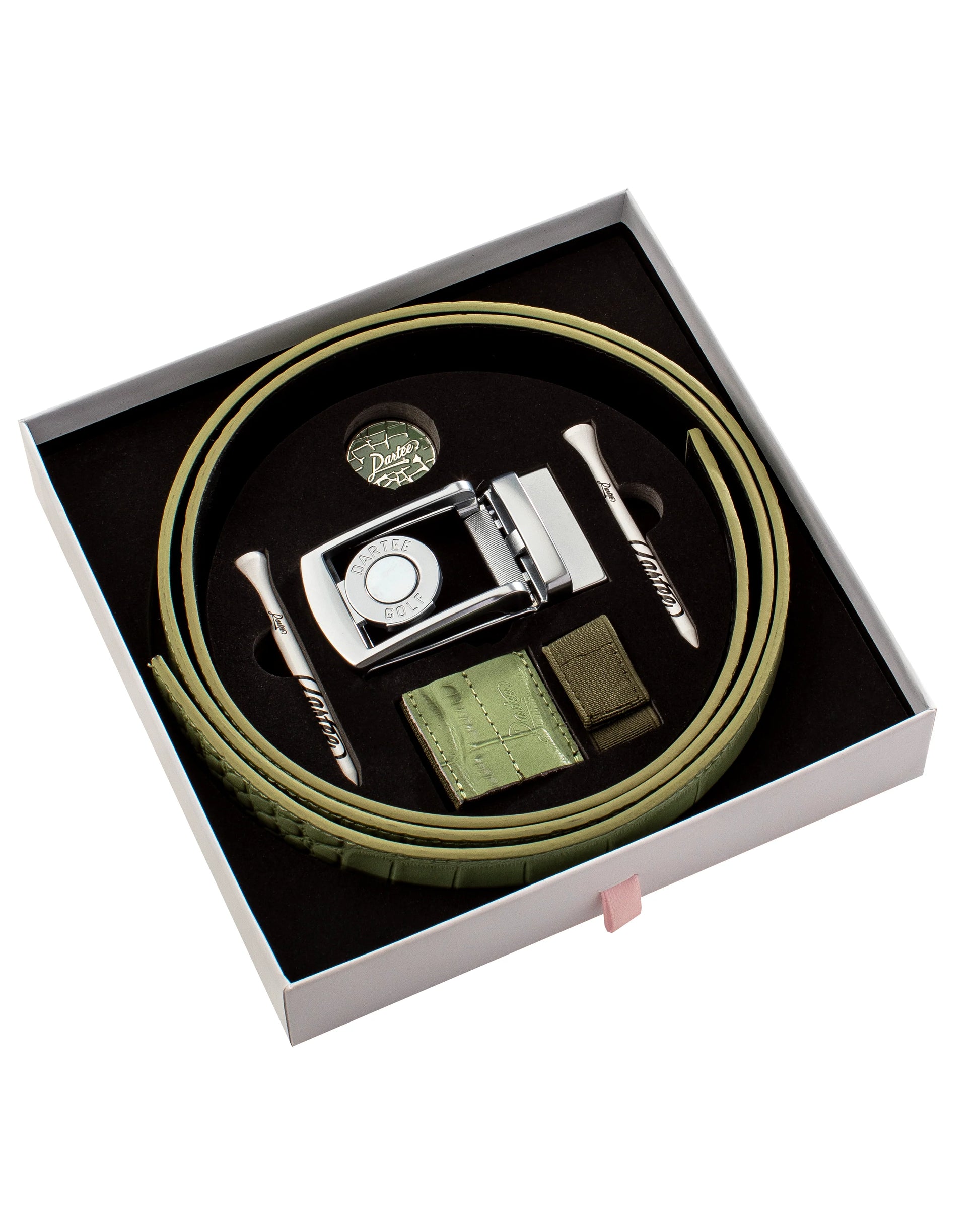 The Greenside Gator Collection is inspired by the pressure-packed patch of grass where the game is won or lost — and by the untamed edge that lives just beyond it. Crafted from genuine hand-painted leather, these belts bring elevated texture and aggressive elegance to players who thrive in the tension of the short game.